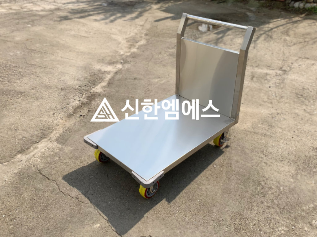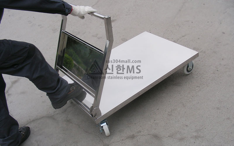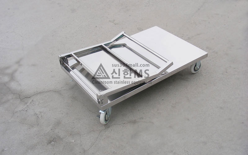 그리고....플라스틱 카트와 같이 접이식도 가능......은 합니다. 접이식 카트의 경우 사실 일반 클린룸 사업장에서는 별로 사용할 일이 없습니다. 하지만 클린룸 업체에 물품을 납품하거나 공사를 위해서 자재를 반입.반출 하는 경우 클린룸업체의 환경에 맞춰야 하기 때문에 필요한 경우들이 있습니다. - 사실 이런경우라도 적재공간만 문제 없으면 그냥 기본 제품 사용하시는게 낫죠..... - 그런데 그렇지 못한 경우 접이식 스텐카트를 원하는 업체가 있는데 제가 왜 '제작은 가능...은 합니다' 라고 말하냐면 이건 수량이 5대 이상은 되어야 제작이 가능 합니다. 원래 저희 신한엠에스가 수량이 적다고 제작 안하는 곳은 아닙니다만, 접이식 카트의 경우 접기 위한 부속을 가공해야 하는데 5대 미만으로는 그게 안돼요 ㅠ 주문수량이 5대가 넘어가는 경우에만 견적의뢰 주세요