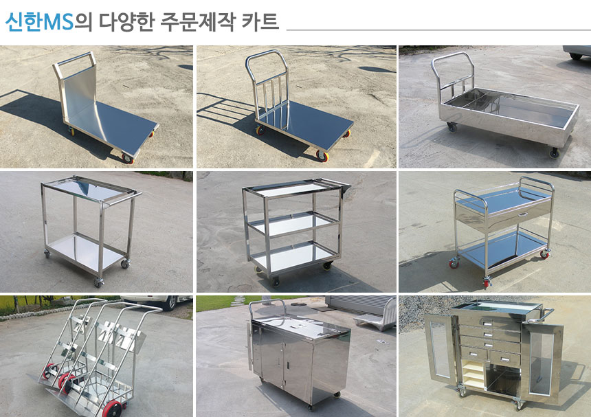 그리고....플라스틱 카트와 같이 접이식도 가능......은 합니다. 접이식 카트의 경우 사실 일반 클린룸 사업장에서는 별로 사용할 일이 없습니다. 하지만 클린룸 업체에 물품을 납품하거나 공사를 위해서 자재를 반입.반출 하는 경우 클린룸업체의 환경에 맞춰야 하기 때문에 필요한 경우들이 있습니다. - 사실 이런경우라도 적재공간만 문제 없으면 그냥 기본 제품 사용하시는게 낫죠..... - 그런데 그렇지 못한 경우 접이식 스텐카트를 원하는 업체가 있는데 제가 왜 '제작은 가능...은 합니다' 라고 말하냐면 이건 수량이 5대 이상은 되어야 제작이 가능 합니다. 원래 저희 신한엠에스가 수량이 적다고 제작 안하는 곳은 아닙니다만, 접이식 카트의 경우 접기 위한 부속을 가공해야 하는데 5대 미만으로는 그게 안돼요 ㅠ 주문수량이 5대가 넘어가는 경우에만 견적의뢰 주세요
