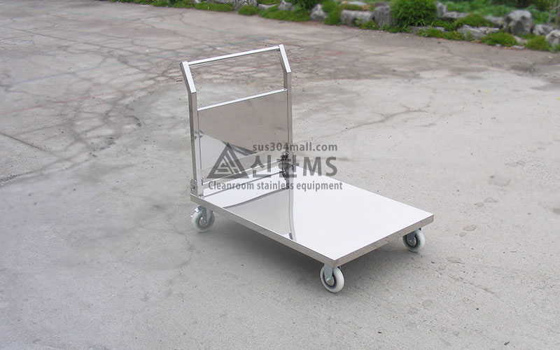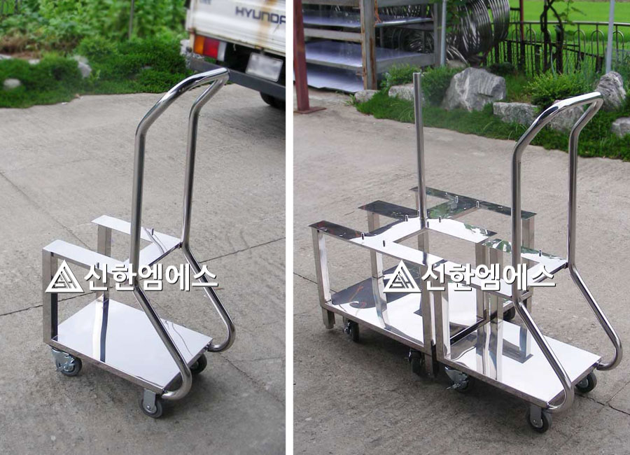 그리고....플라스틱 카트와 같이 접이식도 가능......은 합니다. 접이식 카트의 경우 사실 일반 클린룸 사업장에서는 별로 사용할 일이 없습니다. 하지만 클린룸 업체에 물품을 납품하거나 공사를 위해서 자재를 반입.반출 하는 경우 클린룸업체의 환경에 맞춰야 하기 때문에 필요한 경우들이 있습니다. - 사실 이런경우라도 적재공간만 문제 없으면 그냥 기본 제품 사용하시는게 낫죠..... - 그런데 그렇지 못한 경우 접이식 스텐카트를 원하는 업체가 있는데 제가 왜 '제작은 가능...은 합니다' 라고 말하냐면 이건 수량이 5대 이상은 되어야 제작이 가능 합니다. 원래 저희 신한엠에스가 수량이 적다고 제작 안하는 곳은 아닙니다만, 접이식 카트의 경우 접기 위한 부속을 가공해야 하는데 5대 미만으로는 그게 안돼요 ㅠ 주문수량이 5대가 넘어가는 경우에만 견적의뢰 주세요