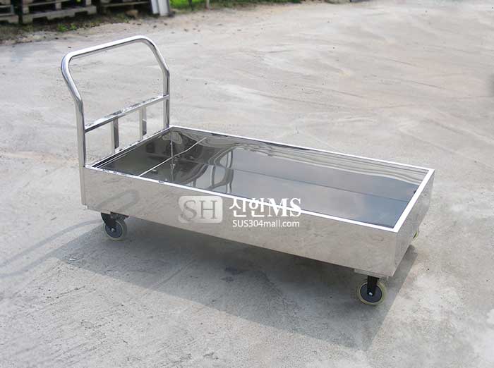 아래의 스텐카트 형태는 L106에서 보다 단순하게 변경된 형태 입니다. 제작비용이 조금 낮아지는 장점이 있는 반면 밀고 다닐때 발이 카트에 부딪히지 않도록 조심할 필요가 있습니다. 대부분 카트의 손잡이가 굴곡지며 밖으로 빠져 있는 것은 밀고, 끌때 발이 카트와 부딪히는 것을 방지하는 목적이 크거든요. 보통 이런 형태는 단순히 가격을 낮추려는 목적이 아니라 다른 테이블이나 캐비닛같은곳에 카트를 딱 밀어 넣고 손잡이가 추가적으로 돌출되지 않기를 바란다던지 하는 목적성이 있는 경우가 더 많습니다.